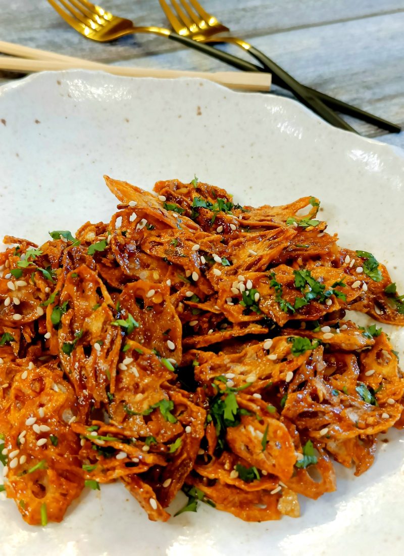 Crispy Lotus Stem in Honey Chilli Sauce, is a delicious starter made with air fried lotus stem in sweet and spicy sauce.