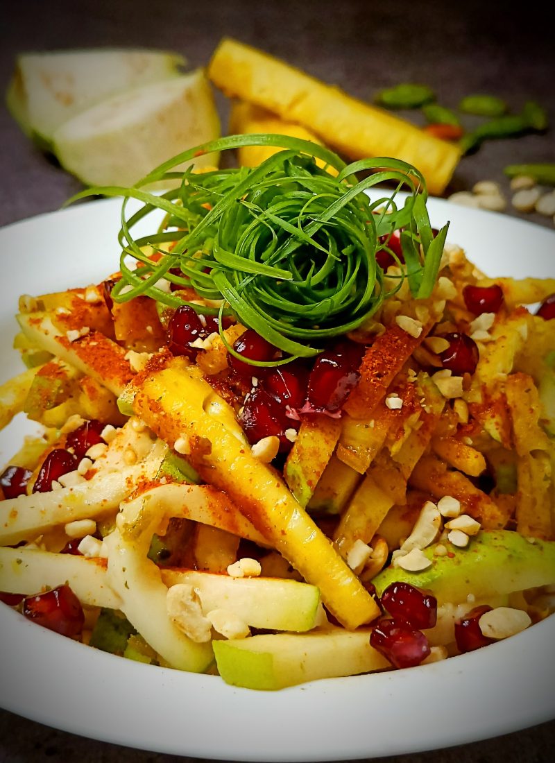 Crispy Guava and juicy Pineapple come together with tangy dressing.Topped with roasted peanuts and some pomegranate for that extra crunch. Perfect as a light appetizer, a side dish or a healthy snack.